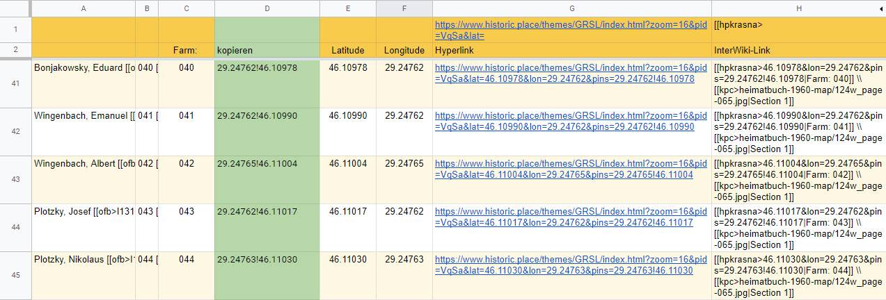 =VERKETTEN($G$1;E41;„&lon=“;F41;„&pins=“;F41;„!“;E41) - Spalte H - InterWiki-Link zur Verwendung in DokuWiki generieren
