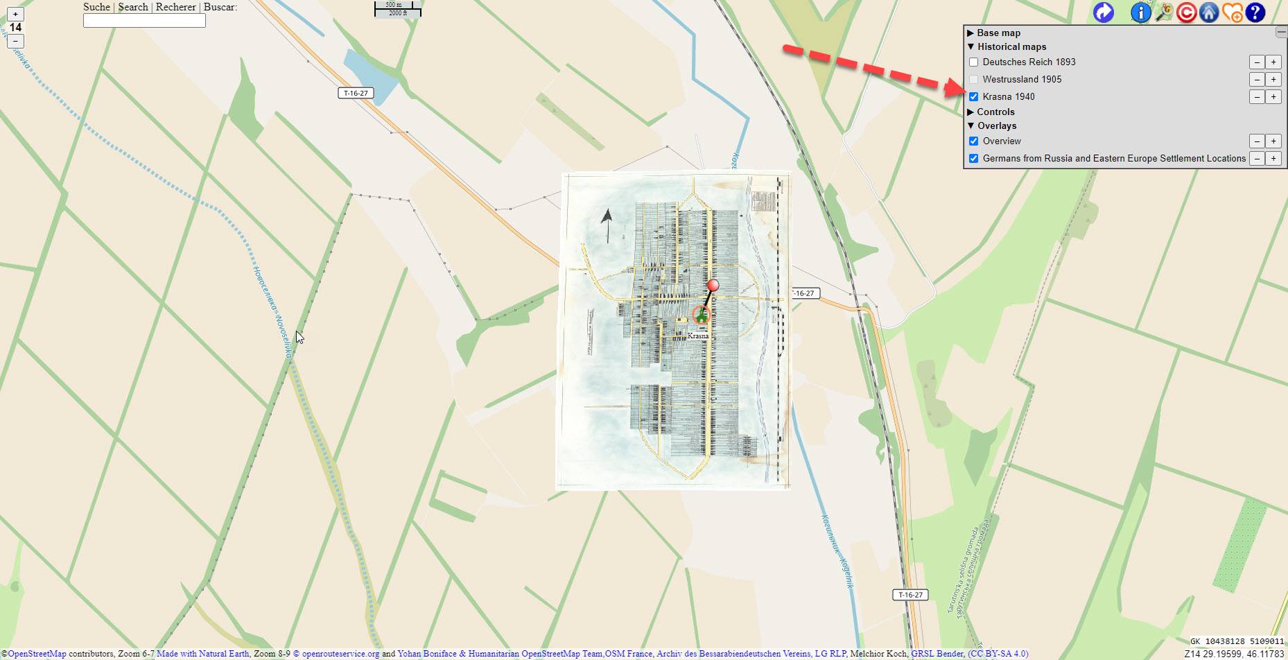 Es gibt einen Ortsplan von Krasna. Gezeichnet 1982 von Melchior Koch. Dieser Plan wird im Menü Kartenebenen hinzu aktiviert.
